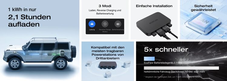 Laden Sie Ihre Powerstation bequem während der Fahrt wieder auf – bis zu fünfmal schneller als über eine herkömmliche 12-Volt Kfz-Bordsteckdose. Das EcoFlow 500 W Batterieladegeraet nutzt die überschüssige Energie, die Ihr Fahrzeug erzeugt, besonders effizient: Dank des integrierten DC-DC-Wandlers wird der Strom direkt in Ihre Powerstation eingespeist und sorgt für eine schnelle und zuverlässige Aufladung –automatisch während der Fahrt.