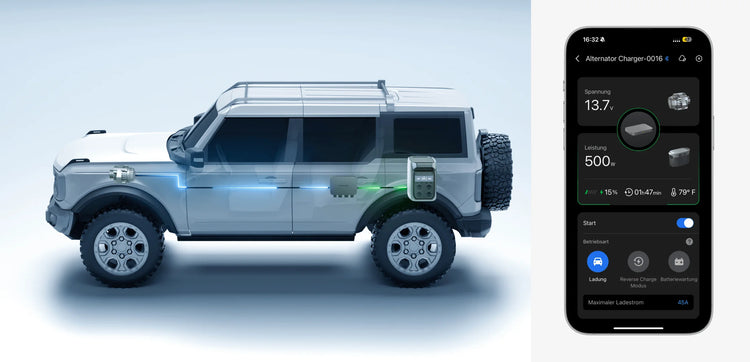 Falls Sie noch mehr Ladeleistung bednötigen oder ein Fahrzeug mit einer Lichtmaschinenleistung von mehr als 150 A ausrüsten möchten, empfehlen wir den EcoFlow Alternator-Charger mit 800 Watt.