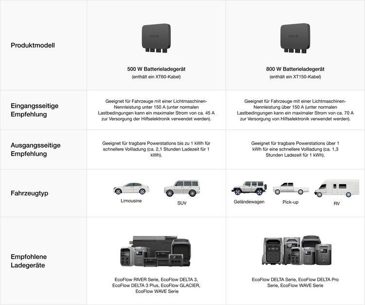 *Hinweis: Der Alternator-Charger 500 W wird mit einem XT60-Kabel geliefert, das XT-60 Kabel unterstützt jedoch keine Reverse Charging und Batteriewartungsfunktionen. Um die Funktionen Reverse Charging und Batteriewartung zu nutzen, dann wählen Sie bitte das passende XT150-Kabel und verwenden es mit einem EcoFlow DELTA2 oder DELTA Pro 3600 Serie oder neuer (Anschluss: "Extra-Battery-Port" erforderlich).