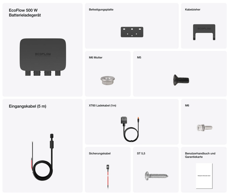Der Alternator-Charger 500 Watt wird mit einem XT60i-Kabel geliefert. Für die Nutzung der Reverse Charging- und Batteriewartungsfunktionen ist optional ein XT150-Kabel erforderlich. Die Reverse Charging- und Batteriewartungsfunktionen sind nur mit Powerstationen der EcoFlow DELTA2 und DELTA Pro 3600 Serie oder neuer kompatibel, welche über den "Extra-Battery-Port" verfügen. Bei Verwendung mit tragbaren Powerstations von Drittanbietern stehen diese erweiterten Funktionen nicht zur Verfügung.