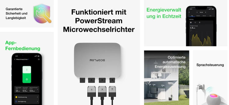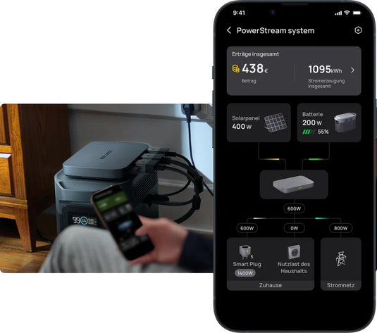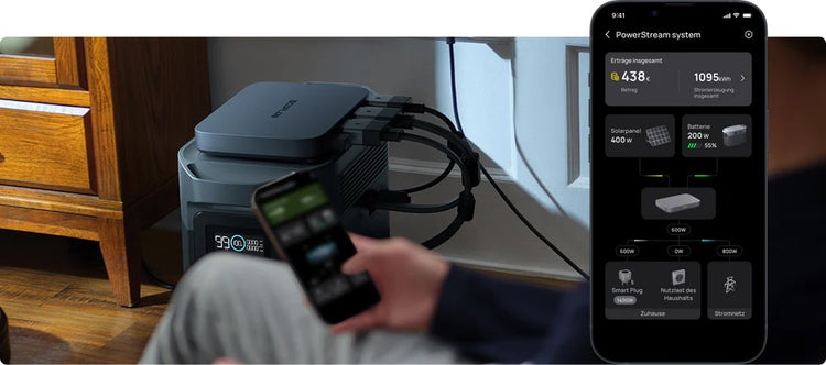 Smart Plugs überwachen den Energieverbrauch der Geräte, sodass der Mikrowechselrichter jedem Gerät genau die richtige Energiemenge zuweisen kann und den Überschuss an eine tragbare Powerstation weiterleitet. In Spitzenzeiten priorisiert das System die Nutzung im Haushalt. Ausserhalb der Spitzenzeiten wird der grösste Teil der Energie gespeichert.