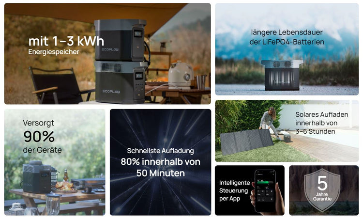 Kombinieren Sie Ihre Powerstation mit einer Vielzahl von EcoFlow-Produkten wie tragbaren Solarpanels, Zusatzakkus und vielem mehr. So erstellen Sie eine individuelle Komplettlösung für Ihre Familie.