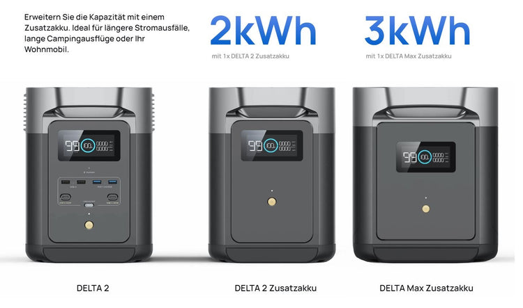 Mit einer Basiskapazität von 1 kWh haben Sie immer genug Strom, wenn es darauf ankommt. Benötigen Sie mehr? Verdoppeln Sie Ihre Kapazität mit dem DELTA 2 Zusatzakku auf 2048 Wh, oder nutzen Sie den DELTA Max Zusatzakku, um 3040 Wh zu erreichen. Ideal als Notstromversorgung für Haushaltsgeräte.
