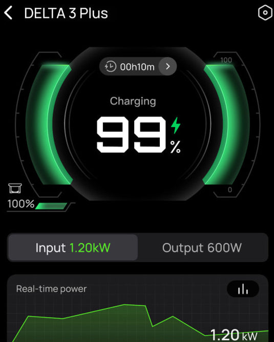 Nutzen Sie die Kraft der Sonne: Im täglichen Gebrauch kann die DELTA 3 Plus sowohl mit AC-Wechselstrom aus dem Hausnetz als auch mit Solarenergie aufgeladen werden, wobei die Solarenergie Vorrang hat. Das ist nicht nur gut für die Umwelt, sondern schont auch Ihren Geldbeutel. Bei einer maximalen Eingangsleistung von 1500 Watt ist das Gerät in nur 56 Minuten vollständig aufgeladen.