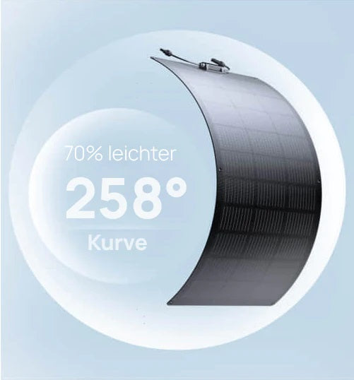 Unser 100 Watt flexibles Solarpanel ist aussergewöhnlich leicht – ca. 70 % leichter als herkömmliche Solarpanels – wodurch sowohl der Transport als auch die Installation bedeutend erleichtert werden. Das flexible Solarpanel lässt sich um bis zu 258 Grad biegen und kann so ganz einfach der individuellen Form Ihres Wohnmobils angepasst werden - ohne die Sonneneinstrahlung zu beeinträchtigen.