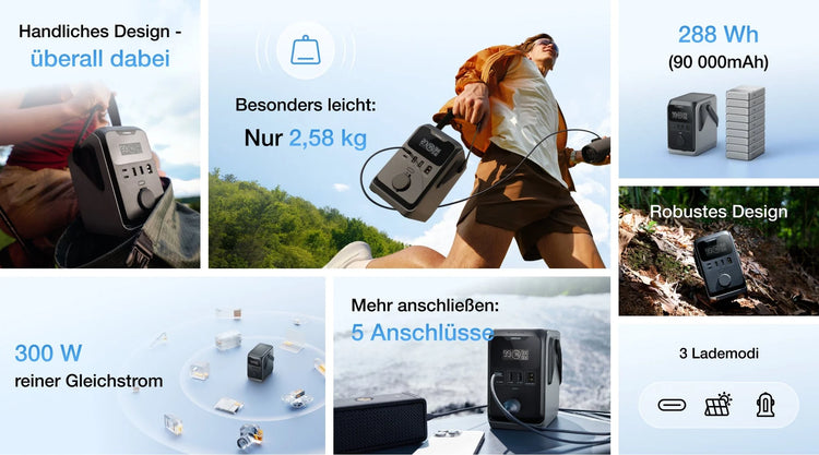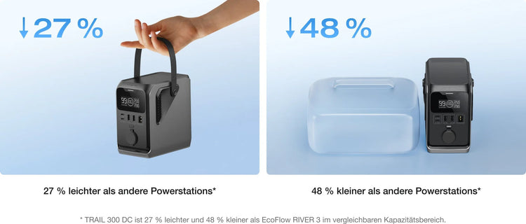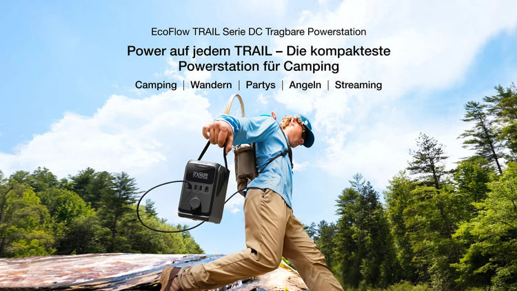 Ob beim Camping, auf Reisen, im Vanlife oder im professionellen Einsatz: Über die USB-C- und USB-A-Anschlüsse sowie den 12-V-KFZ-Ausgang laden Sie mehrere Geräte gleichzeitig – effizient, sicher und unabhängig vom Stromnetz. Die robuste Bauweise, das kompakte Design und die bewährte EcoFlow-Technologie machen die TRAIL 300 DC zur idealen Lösung für alle, die mobile Energie ohne Kompromisse suchen.