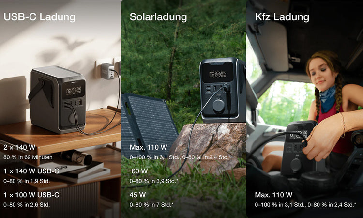 Flexibles Laden über USB-C, Kfz-Steckdose oder Solarpanels für zuverlässige Energie in jeder Outdoor-Situation.