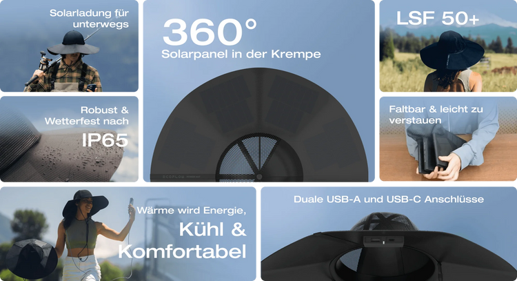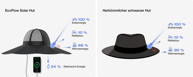 Les panneaux solaires conventionnels doivent être orientés de manière optimale avec le soleil. Grâce à sa conception à 360 degrés, l'EcoFlow Solar Hat est toujours dans l'angle optimal par rapport au soleil. Il recharge complètement un téléphone portable en seulement 3 à 4 heures.