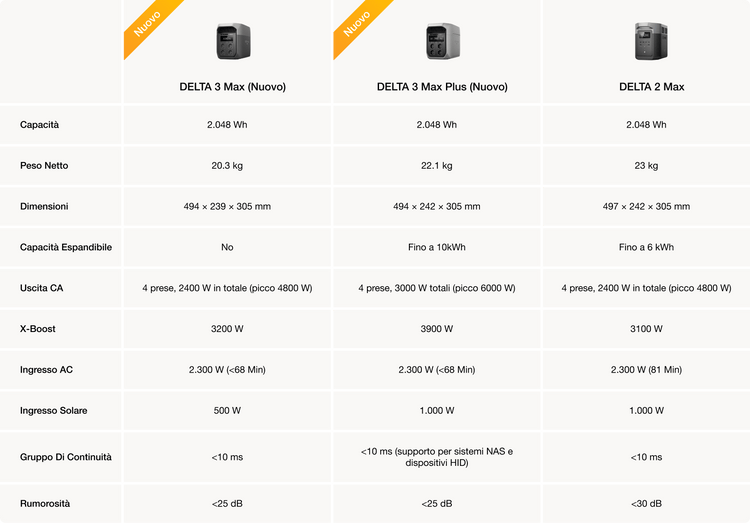 La nuova serie EcoFlow DELTA 3 rappresenta un significativo passo avanti rispetto alla precedente serie DELTA 2. Mentre la serie DELTA 2 era stata progettata principalmente per applicazioni mobili, campeggio e uso quotidiano, i nuovi modelli DELTA 3 offrono una capacità notevolmente maggiore, prestazioni più elevate e funzionalità modernizzate per applicazioni più impegnative. Il confronto dimostra chiaramente quanto i modelli DELTA 3 Max e DELTA 3 Max Plus superino la collaudata serie DELTA 2 in termini di potenza, espandibilità e versatilità.