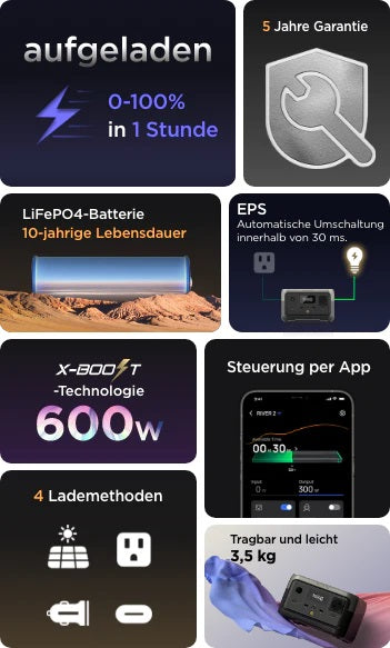 Grazie alla composizione migliorata a lunga durata della batteria LFP, è possibile caricare e scaricare la serie RIVER 2 oltre 3000 volte . Si tratta di ben 10 anni di utilizzo quotidiano¹: sei volte di più rispetto alla media del settore. Grazie alle celle LFP, la serie RIVER 2 è sicura, durevole e altamente efficiente, anche a temperature più elevate .