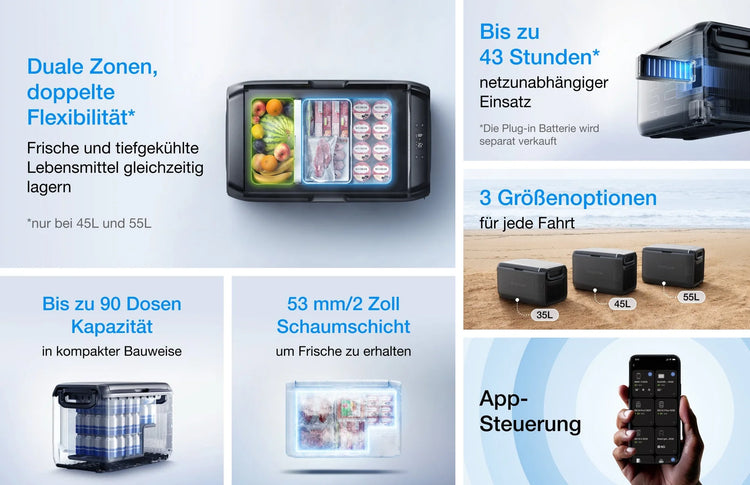 Dank individuell regelbarer Temperaturbereiche von -20 °C bis +20 °C können Sie auf der einen Seite eiskalte Getränke geniessen, während auf der anderen Seite empfindliche Lebensmittel sicher tiefgekühlt bleiben. Die beiden Zonen unterstützen dabei einen Temperaturunterschied von bis zu 22 °C – ideal für unterschiedlichste Bedürfnisse bei Camping, Outdoor-Küche oder professionellem Einsatz.