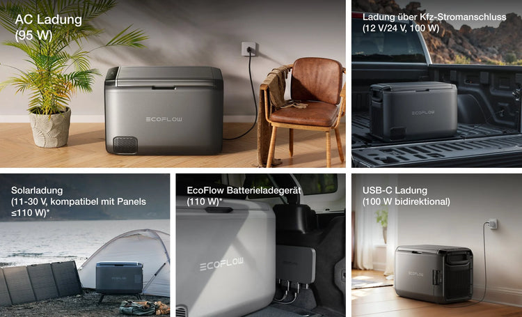 Die Laufzeit kann zusätzlich verlängert werden, indem ein EcoFlow Solarpanel mit bis zu 110 Watt Leistung direkt angeschlossen wird – für netzunabhängiges Kühlen mit der Kraft der Sonne.